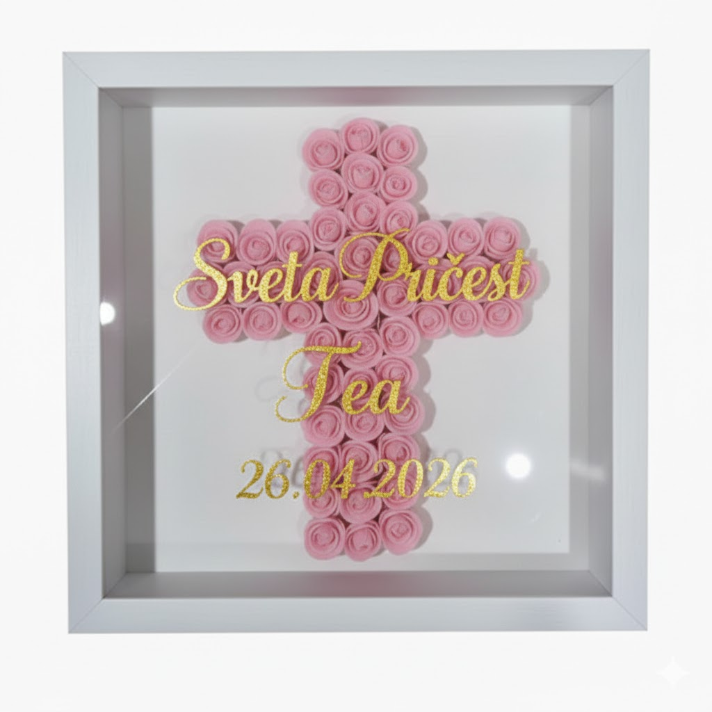 Personalizirani 3d okvir s rozim ružama u obliku križa idealno za poklon za prvu pričest, krizmu ili krštenje. Tekst je napisan u zlatnom tisku i može se prilagoditi.