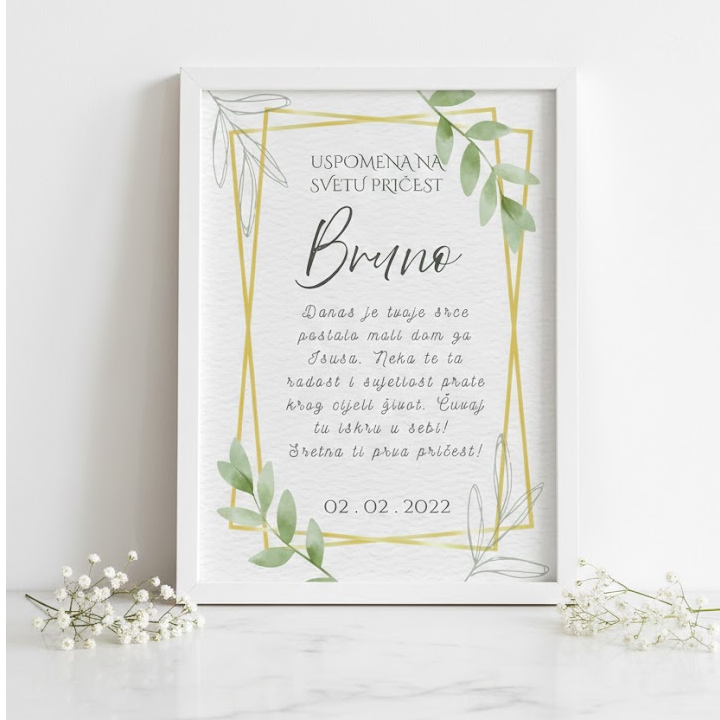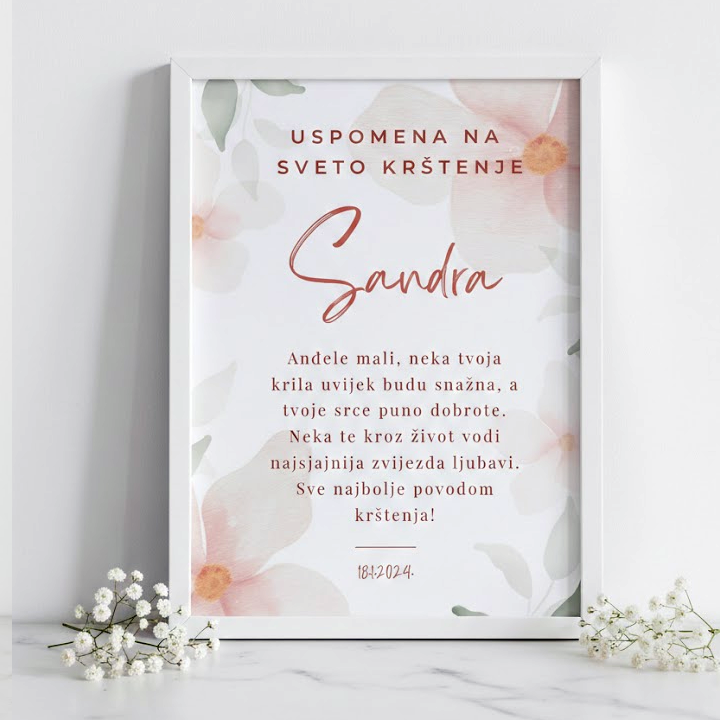 Personalizirani okvir s posvetom koja može biti kao dar za krštenje, pričest, krizmu, vjenčanje, rođendan i sve druge prigode, a isto tako može poslužiti kao zahvalnica kumovima i gostima. Dostupan i u drugoj boji.