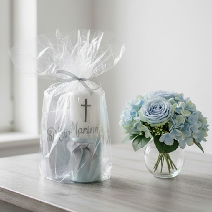 Personalizirana svijeća sa zlatnim detaljima: Visokokvalitetna svijeća (dimenzije: 19 cm x 6,8 cm) ukrašena imenom djeteta i datumom krštenja u zlatnim tonovima. Zlatna dekoracija i vrpca čine je upečatljivim simbolom vjere koji će osvijetliti ovaj poseban dan.