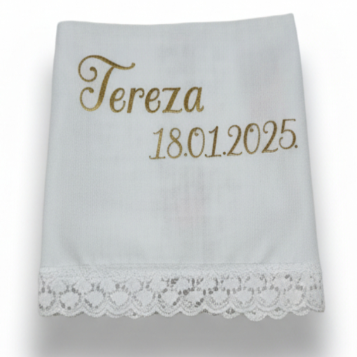 Krsna marama sa zlatnim tiskom: Izrađena od visokokvalitetnog bijelog materijala s precizno otisnutim imenom u zlatnoj boji. Simbolizira čistoću i novi život, uz dodatak kraljevske zlatne note.
