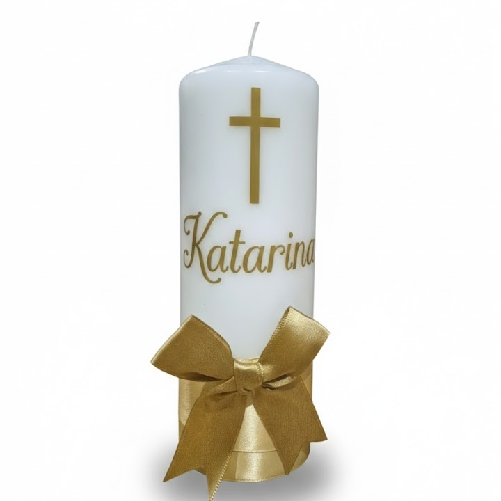Personalizirana svijeća sa zlatnom dekoracijom: Elegantna bijela svijeća (19 cm x 6,8 cm) s imenom djeteta i datumom krštenja. Ukrašena je bogatom zlatnom mašnom i detaljima koji će zasjati u punom sjaju tijekom obreda na oltaru.